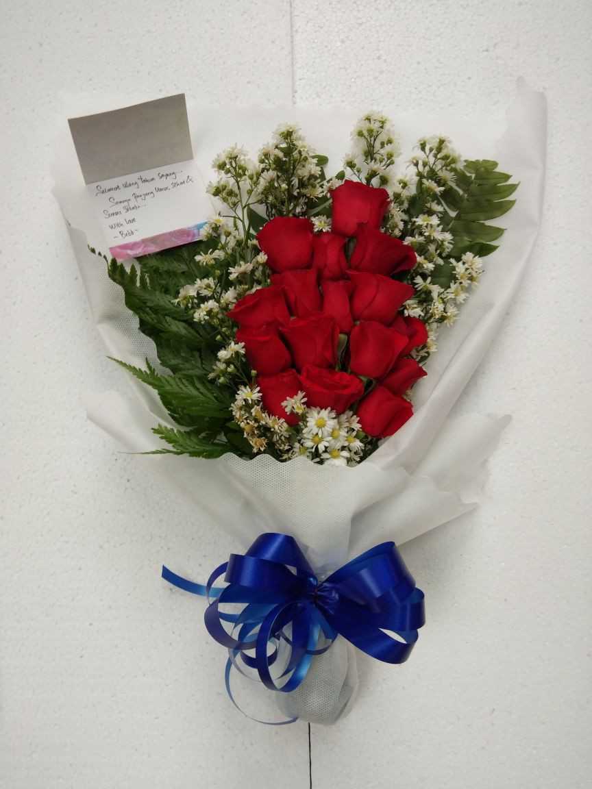 Hand Bouquet Mawar, cocok untuk ucapan, anniversary, ulang tahun, selamat & sukses, perasaan cinta, kasih sayang, permohonan maaf, ukuran standar, bentuk memanjang isi 20 batang, warna bunga dan tisu bisa dikombinasikan
